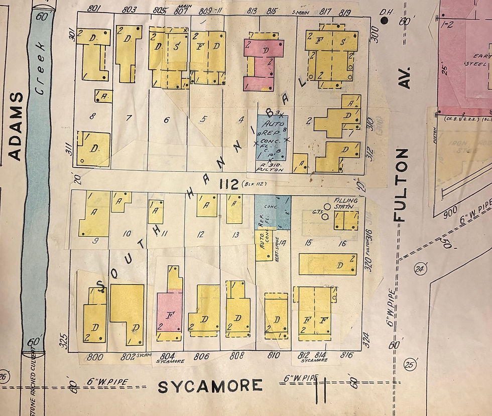 A Sanborn Fire Prevention map, updated in the early 1950s, shows the Cox family’s filling station at 316 Fulton. Next door to the west was the family’s house, at 320 Fulton. You can see the single-story concrete auto shop behind the gas station. A close look at the filling station shows a shadow where the family’s single-story duplex stood prior to the filling station’s construction. Members of the Cox family lived in this portion Fulton Avenue from pre-1912 until mid 1985, some 70-plus years. The filling station and house were torn down following the 1993 flood. Sanborn map shared by Judy Cernea.